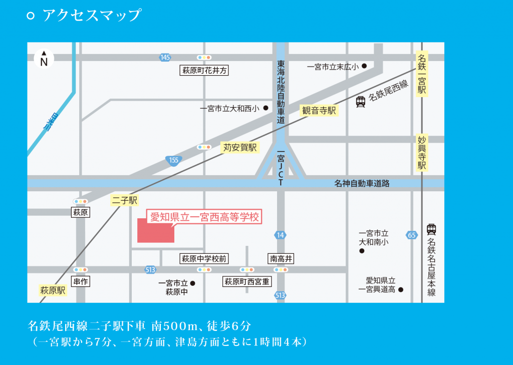 アクセス 2026年1月15日 本校周辺の地図 ■ 所 在 地 〒491-0376 愛知県一宮市萩原町串作字河田1番地■ 最寄り駅 名鉄尾西線二子駅(南へ500m・徒歩6分)■ TEL(0586)68-1191■ FAX(0586)69-0196